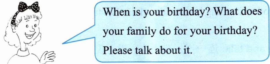 c. My birthday is on July 10th. My family makes a birthday cake. They give me toys. We sing "Happy Birthday" together.