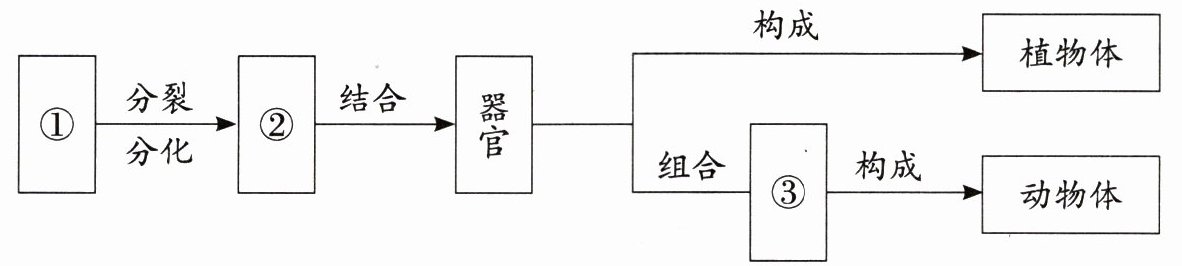 1. 概念框架图可以形象地反映生物学概念间的关系。下图是某同学学习了本章知识后画出来的生物体结构层次的概念框架图,其中①、②、③分别表示(