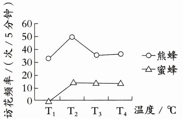 5. 熊蜂和蜜蜂都能为农作物传粉。为研究哪一种蜂更适合给温室大棚中的农作物传粉,某生物学兴趣小组的同学对熊蜂和蜜蜂访问花朵的行为(简称访花行为)进行了研究。同学们根据温室中一天内的温度变化规律,将一天中的温度划分为 4 个区间,即 $ T_1 \leq 14^{\circ}C $、$ 14^{\circ}C < T_2 \leq 19^{\circ}C $、$ 19^{\circ}C < T_3 \leq 24^{\circ}C $、$ T_4 > 24^{\circ}C $,通过观察、记录,统计熊蜂和蜜蜂在不同温度下访花的频率绘制下图(注:访花一次即从接触一朵花到离开此花)。分析回答下列问题。