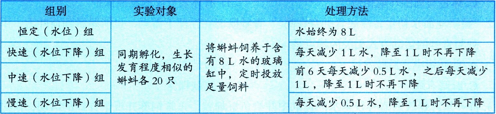 11. 全球变暖会影响两栖类的生长发育吗?科研人员认为升温加快了两栖类栖息地的干涸速度,因此他们通过模拟实验探究自然状态的水位变化对蝌蚪生长的影响。实验处理方法如下表所示。