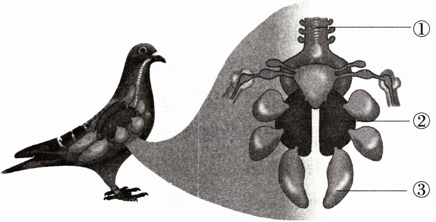 13. 下图为家鸽的气囊示意图,据图回答下列问题([ ]内填写图中序号)。