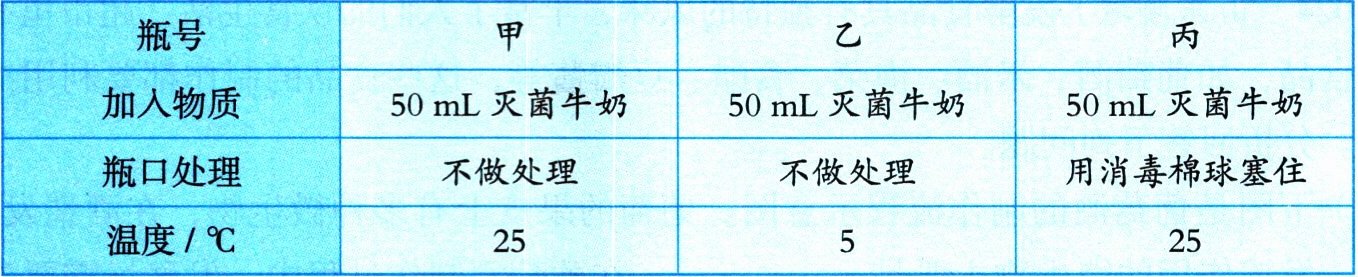 19. 为了探究食品腐败的原因和细菌生存的条件,某学校生物学兴趣小组取经过消毒的甲、乙、丙三个相同的锥形瓶,按下表要求进行了实验。