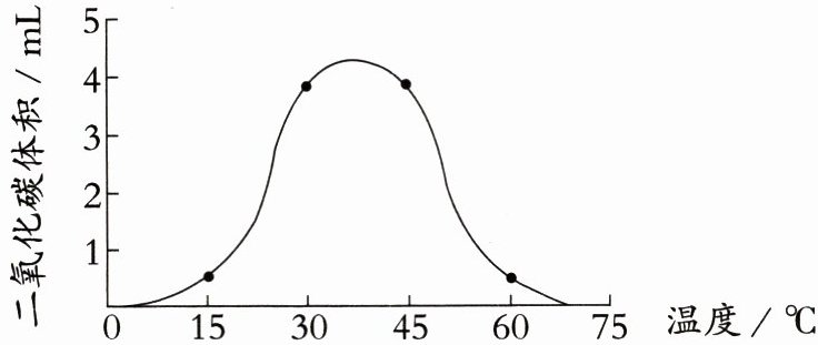 18. 下图表示发面时温度对面团中二氧化碳产生量的影响。以下分析正确的是(