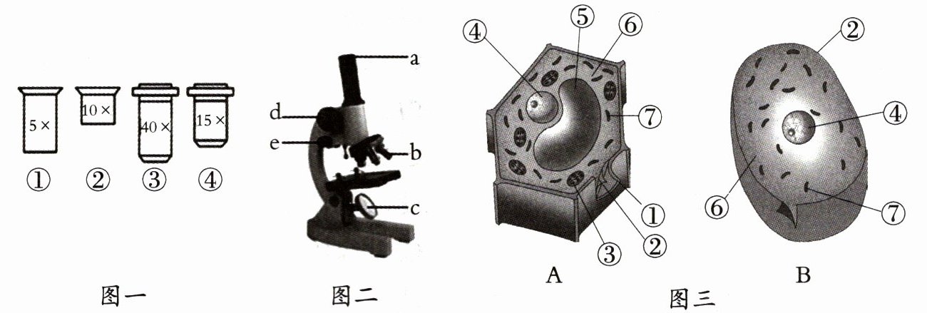 (填序号)两个透镜观察。(2)为了看清菠菜叶肉细胞中的液泡,他稍微调暗了视野。他调节的是图二中显微镜的结构