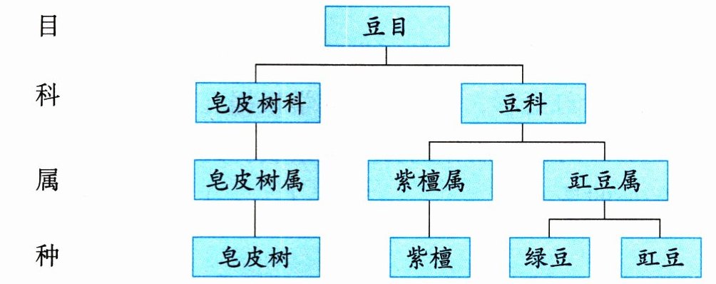 (1)皂皮树 绿豆与红豆是同属植物,与皂皮树是同目植物。目比属等级高,分类单位越大,所包含的生物的共同特征越少 (2)目 (3)紫檀、紫檀属、豆科、豆目 (4)有利于了解每种生物的分类地位,并找出不同生物间亲缘关系的远近;有利于对生物的认识、利用和保护;有利于林业生产和人体的防病、治病等(写出一条即可)