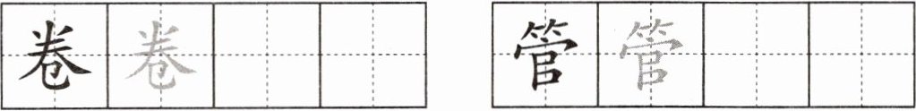 在左侧方格中规范书写“卷”字,注意撇捺舒展;在右侧方格中规范书写“管”字,注意竹字头左小右大。