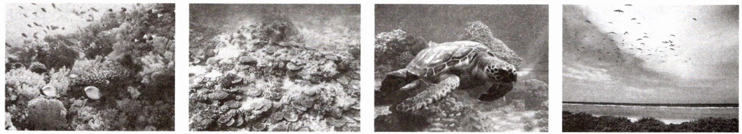 下面四幅图中,有美丽的珊瑚、多彩的鱼、可爱的海龟,还有飞翔的海鸟。请任选一幅图片,模仿《富饶的西沙群岛》的写法,从颜色、样子、神态、动作等方面,围绕一个意思,发挥想象,描写一下图片中的景色。