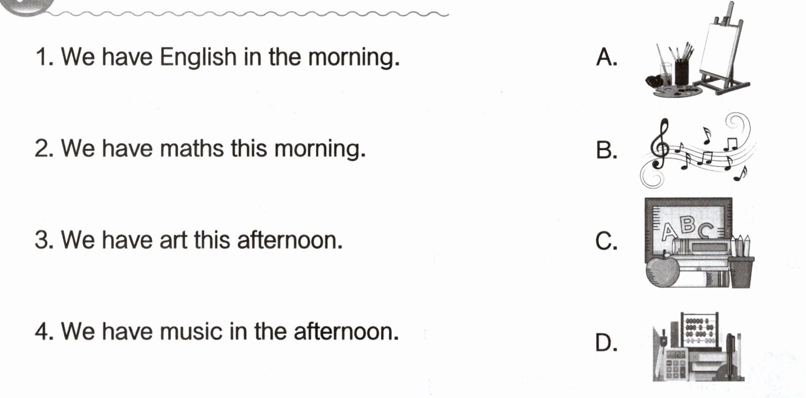 Ⅲ. Read and match. (Tom 已经了解了自己在新学校第一天的课程,请将句子与对应的图片连线。)