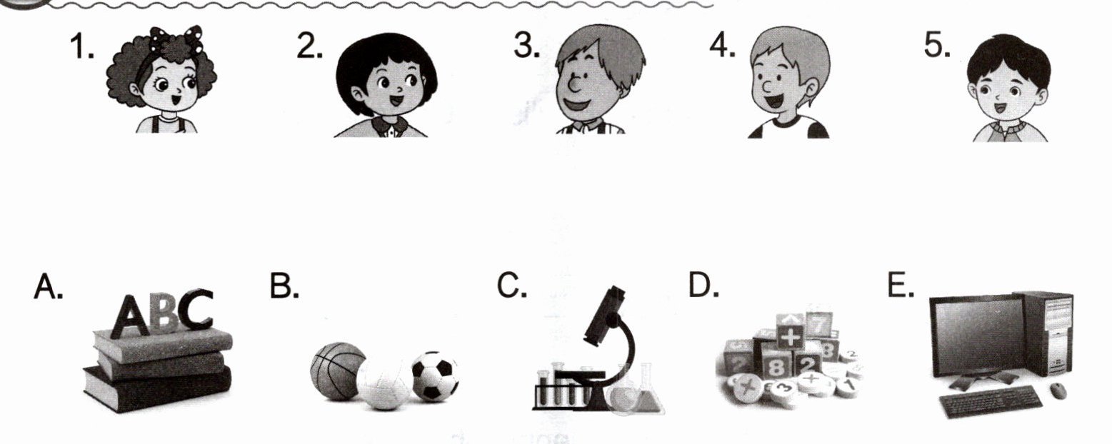 Ⅱ. Listen and match.(同学们都有自己喜欢的科目,请听录音,根据对话内容,将人物与对应的科目连线。)