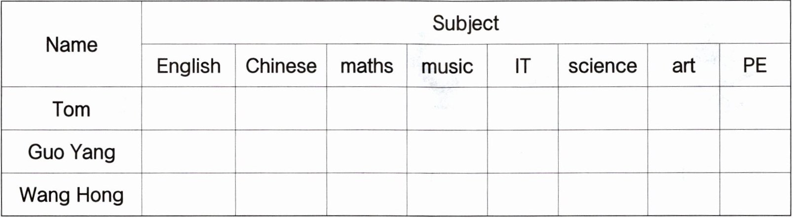 Guo Yang: We have Chinese, maths, art and IT this morning. In the afternoon, we have English and PE. I like Chinese and PE very much. What subjects do you like, Tom?