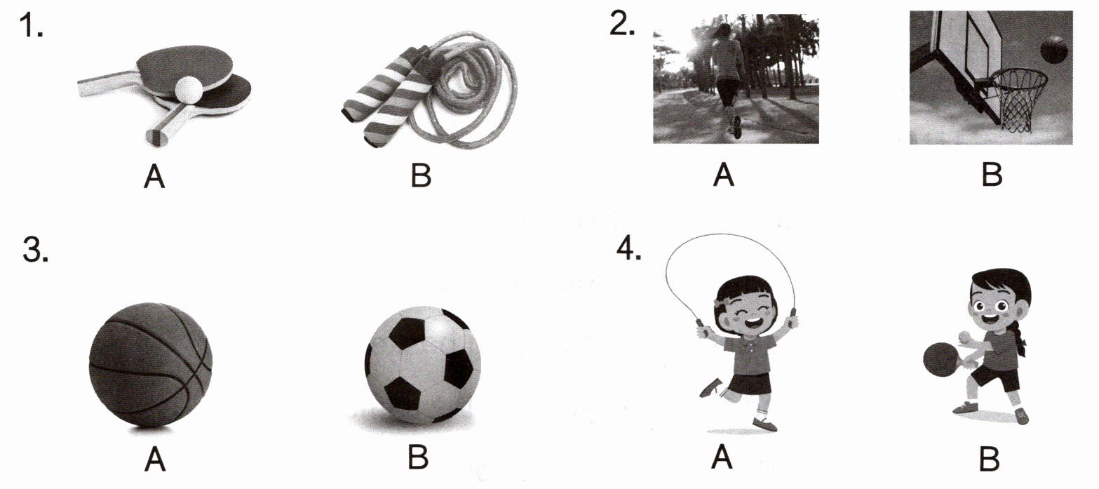Ⅱ. Listen and circle. (今天要开始分小组训练了,同学们互相询问彼此喜欢的运动。请听对话,圈出他们喜欢的运动的图片标号。)