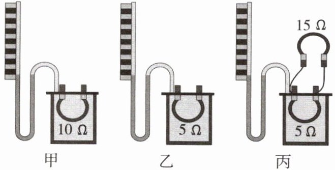 (3)选用乙、丙组合,串联接到电源两端进行实验,发现乙装置$U$形管中液面无高度差,丙装置$U$形管中液面有高度差,产生此现象的原因可能是乙装置
