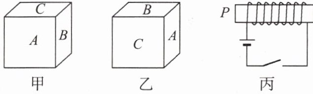 2. 小明捡到一块废弃的正方体磁体,为了探测其磁极性,他将相邻的三面分别用 A、B、C 标记,然后放在透明的塑料袋里,用细线悬挂起来。第一次将磁体按图甲所示放置在塑料袋中,确保 C 面向上,结果 A、B 面在任意方向均可静止。第二次将磁体按图乙所示放置在塑料袋中,结果磁体静止时总是 C 面朝南。