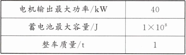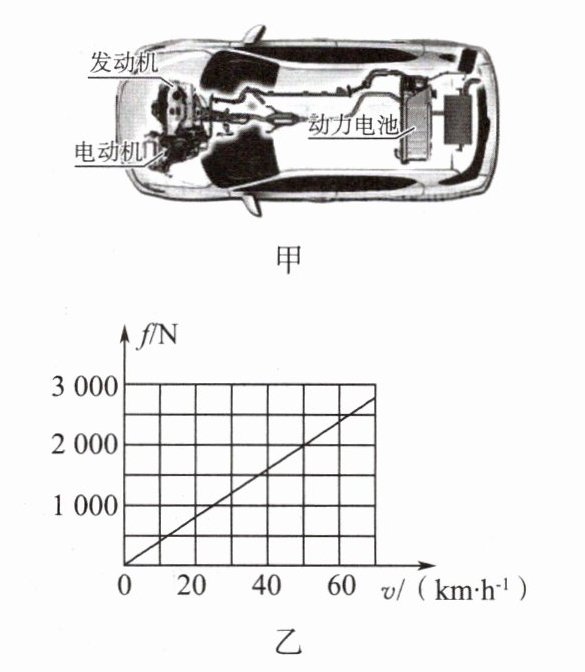 测试人员驾驶该车在平直公路上以 50 km/h 的速度匀速行驶 1 h,观察仪表盘,发现这段时间内燃机消耗燃油 10 kg(燃油热值$ q = 4.0×10^7 J/kg),$蓄电池储存的能量由最大值的 30%增大至最大值的 90%。该车行驶时所受阻力 f 和车速 v 的关系如图乙所示,汽车的某些参数如下表所示。