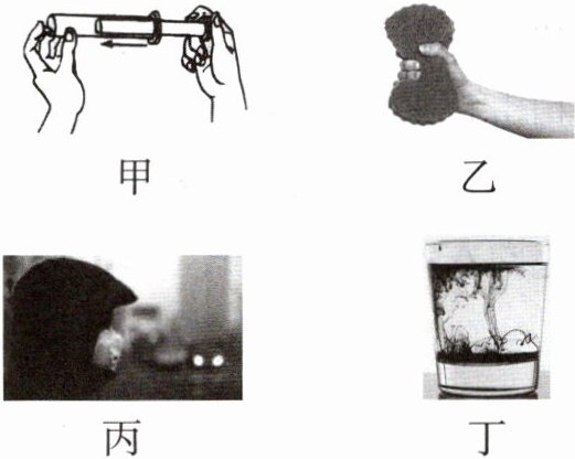 B.图乙:用手捏海绵,海绵的体积变小了,说明分子间有间隙