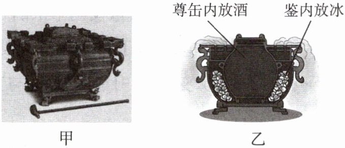 1. 如图甲所示是曾侯乙墓出土的铜冰鉴式保温器。这种保温器分为两层,外层为一方鉴,内层装一方壶,如图乙所示。盛夏之时,方鉴盛冰,内方壶盛酒。下列说法正确的是(