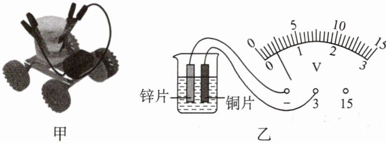9. 图甲是小明在学校科技实践活动中自制的盐水动力车,主要是由盐水电池和一个小电动机组装而成的。图乙是他在测量自制盐水电池的电压。下列说法错误的是(