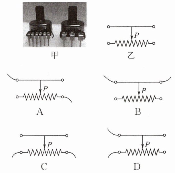 5. 如图甲是音响上音量调节装置,相当于一个滑动变阻器,其简化电路如图乙所示,要使滑片P向右移动时接入电路中的电阻变大,下列连接方式中满足上述要求的是(