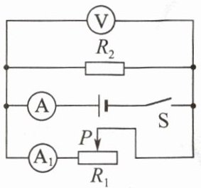 解析:由图可知,两电阻并联,电压表测电源的电压,电流表$A_1$测干路的电流,电流表A测滑动变阻器$R_1$的电流。闭合开关S后,向右移动滑片P,滑动变阻器$R_1$的阻值增大,通过滑动变阻器$R_1$的电流变小,干路的电流变小,即电流表A的示数变小,电流表$A_1$的示数变小,电压表的示数不变,D正确。