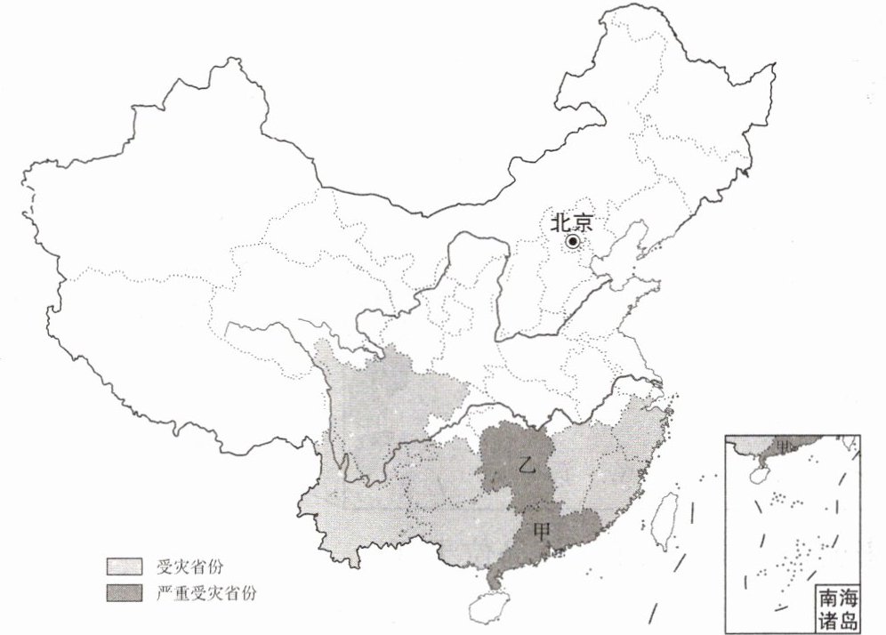 某年 5 月,我国南部地区不断遭遇强降雨袭击,造成大面积洪涝灾害。读图(受灾省份示意图),完成 14~15 题。