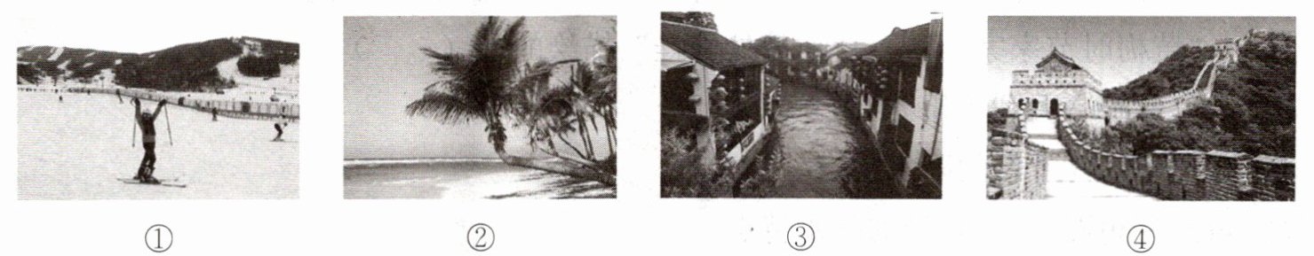 ①滑雪场景观 ②热带椰树景观 ③江南水乡景观 ④长城景观