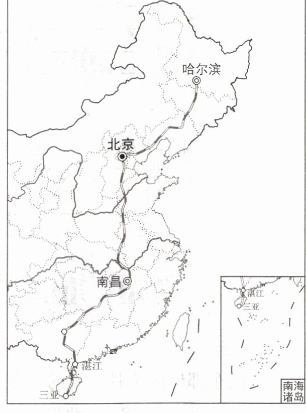 哈尔滨至三亚越冬旅游专线全长4100余千米,是中国目前最长的铁路旅游线路。“越冬专列”主推“慢旅行”,专列路线着重考虑沿途欣赏“窗外风光”的需求,特别采用了“落地窗”的大窗观光车体。下图示意哈尔滨至三亚越冬旅游专线线路。读图,完成2~4题。