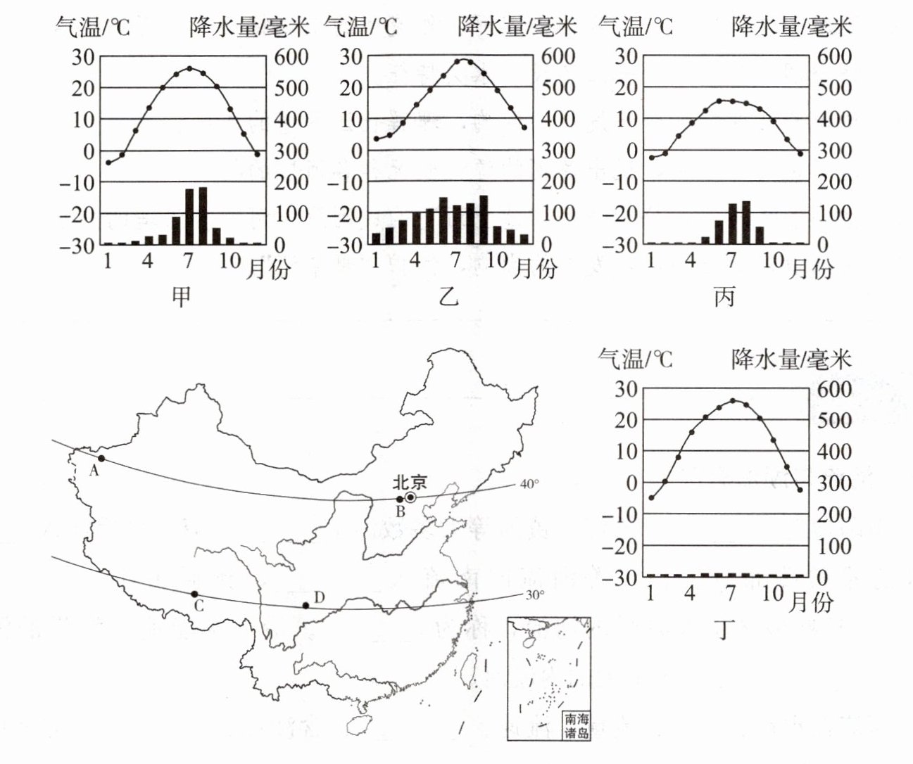 (1)请将甲、乙、丙、丁四种气候类型与A、B、C、D四地配对。