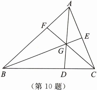 10. 如图,在△ABC 中,点 D,E,F 分别在三边上,E 为 AC 的中点,AD,BE,CF 交于一点 G,BD = 2DC,$S_{△GEC} = 3,$$S_{△GDC} = 4,$则△ABC 的面积是(