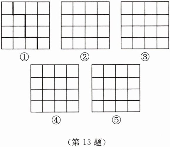 13. 把大小为4×4的正方形方格图形分割成两个全等图形,如图①,请在图②~⑤中,沿着虚线画出四种不同的分法,把4×4的正方形方格图形分割成两个全等图形。