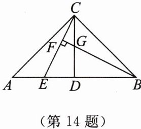 14. 如图,在$\triangle ABC$中,$AC = BC$,$\angle ACB = 90^{\circ}$,$D是AB$的中点,$E是边AB$上的一点,$BF \perp CE于点F$,交$CD于点G$。$AE与CG$相等吗?请说明理由。