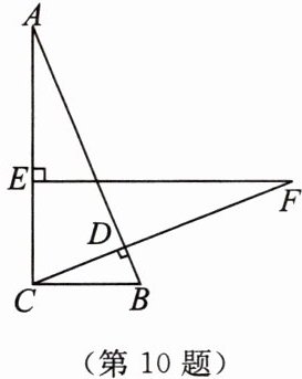 10. 如图,在$Rt \triangle ABC$中,$\angle ACB = 90^{\circ}$,$BC = 2\ cm$,$CD \perp AB$,在$AC上取一点E$,使$EC = BC$,过点$E作EF \perp AC交CD的延长线于点F$。若$EF = 5\ cm$,则$AE = $