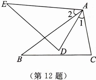 12. 如图,$AB = AE$,$\angle 1 = \angle 2$,$\angle B = \angle E$。$BC与ED$相等吗?请说明理由。