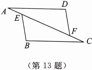 13. 如图,在$\triangle AFD和\triangle CEB$中,点$A$,$E$,$F$,$C$在同一条直线上,$AE = CF$,$\angle B = \angle D$,$AD // BC$。$AD与BC$相等吗?请说明理由。