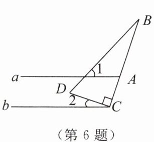 6. 如图,直线$a// b$,直角三角形$BDC$按如图所示的方式放置,$\angle DCB = 90^{\circ}$。若$\angle 1+\angle B = 70^{\circ}$,则$\angle 2$的度数为(