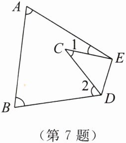 7. 如图,在三角形纸片$ABC$中,$\angle A = 65^{\circ}$,$\angle B = 75^{\circ}$,将纸片的一角折叠,使点$C落在\triangle ABC$内。若$\angle 1 = 20^{\circ}$,则$\angle 2$的度数为