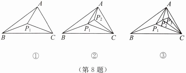 8. 如图①,$\triangle ABC的三个顶点和它内部的点P_{1}把\triangle ABC分成3$个互不重叠的小三角形;如图②,$\triangle ABC的三个顶点和它内部的点P_{1}$,$P_{2}把\triangle ABC分成5$个互不重叠的小三角形;如图③,$\triangle ABC的三个顶点和它内部的点P_{1}$,$P_{2}$,$P_{3}把\triangle ABC分成7$个互不重叠的小三角形……$\triangle ABC的三个顶点和它内部的点P_{1}$,$P_{2}$,$P_{3}$,…,$P_{n}把\triangle ABC$分成