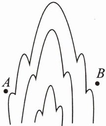 (数学应用) 如图,$ A $,$ B $ 两点被一座小山隔开,现需要测量 $ A $,$ B $ 之间的距离,有皮尺、绳子、木桩若干,请你设计一种测量方案,并说明理由。