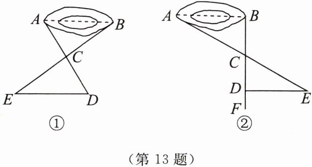 13. 某中学七(5)班的学生到野外进行数学活动,为了测量一池塘两端 $ A $,$ B $ 之间的距离,同学们设计了如下两种方案: