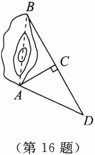 16. 如图,为了测量出$A$,$B$两点之间的距离,在地面上找到一点$C$,连接$BC$,$AC$,使$\angle ACB = 90^{\circ}$,然后在$BC的延长线上确定点D$,使$CD = BC$,那么只要测量出$AD的长度也就得到了A$,$B$两点之间的距离。你能说明其中的道理吗?
