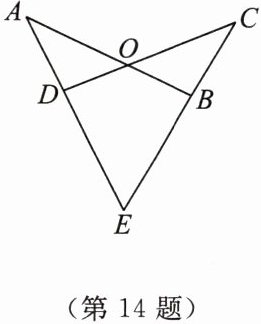 14. 如图,线段$AB$,$CD相交于点O$,$AD$,$CB的延长线交于点E$,$OA = OC$,$EA = $ $EC$。$\angle A与\angle C$相等吗?请说明理由。