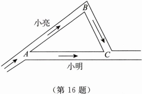 16. 小明和小亮一同骑车外出郊游,如图,当小明到达 $A$ 处时,右拐进入岔道,而小亮仍沿直线向前到 $B$ 处,再到 $C$ 处,当小亮到达 $C$ 处时发现小明已到达 $C$ 处,两人同一时间到达 $A$ 处,且骑车速度一样,为什么小明会先到达 $C$ 处? 你能说明原因吗?