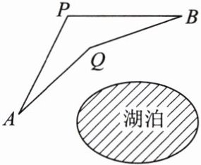 (数学应用)如图,湖边上有 $A,B$ 两个村庄,从 $A$ 到 $B$ 有两条路可走,即 $A \to P \to B$ 和 $A \to Q \to B$。试判断哪条路更短,并说明理由。