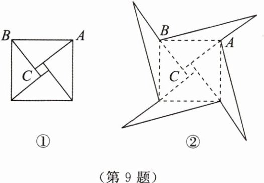 9. 图①是我国古代著名的“赵爽弦图”的示意图,它是由四个全等的直角三角形围成的。若$AC = 6$,$BC = 5$,将四个直角三角形中边长为$6$的直角边分别向外延长一倍,得到如图②所示的“数学风车”,则这个风车的外围周长是