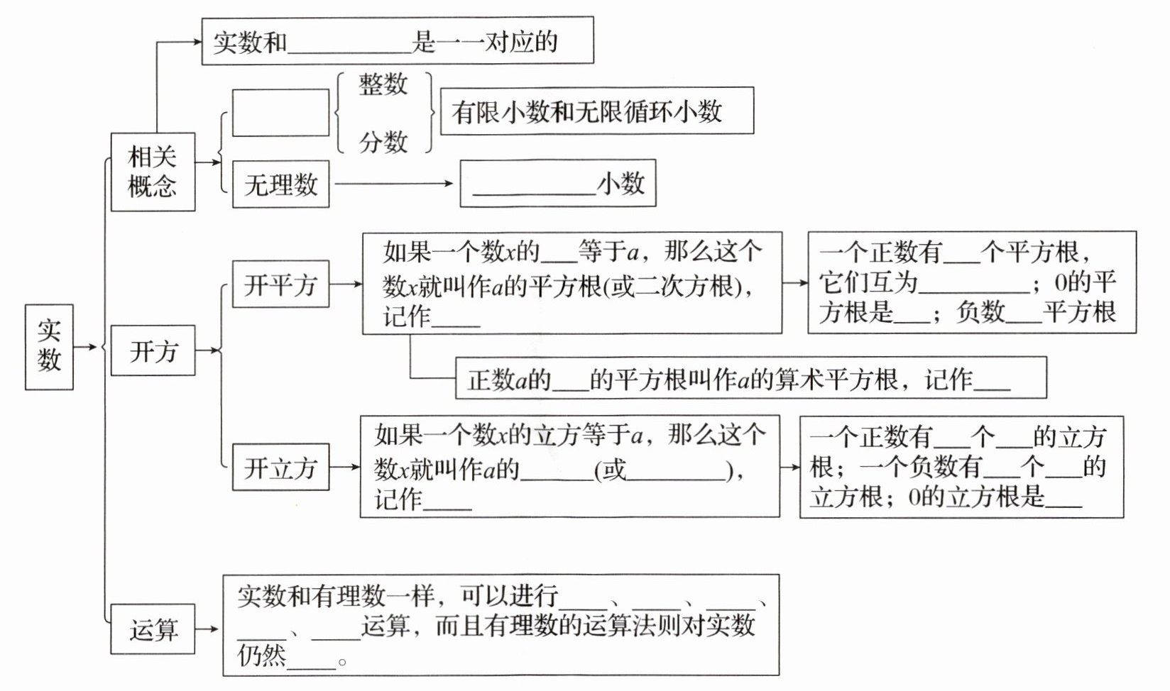 数轴上的点;有理数;无限不循环;平方;±√a;两;相反数;0;没有;正;√a;立方根;三次方根;∛a;一;正;一;负;0;加;减;乘;除;乘方;适用