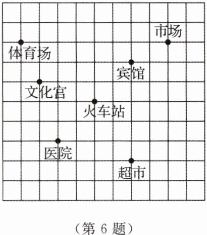 6. 如图,小明想建立平面直角坐标系,使医院的坐标为 $ (0,0) $,火车站的坐标为 $ (2,2) $。