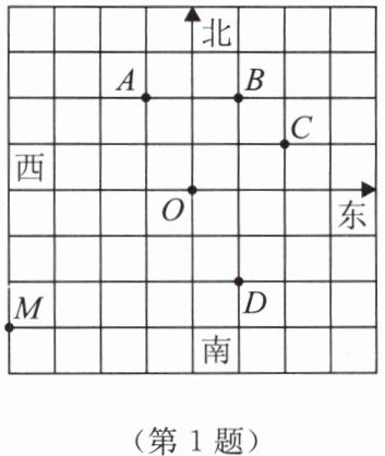 1. 如图,小明从点 $ O $ 出发,先向西走 $ 40 \, m $,再向南走 $ 30 \, m $ 到达点 $ M $。如果点 $ M $ 的位置用 $ (-40,-30) $ 表示,那么 $ (10,20) $ 表示的是(