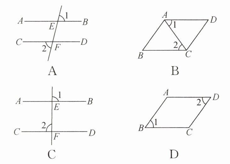 1. 下列图形中,由∠1 = ∠2能得到AB // CD的是(