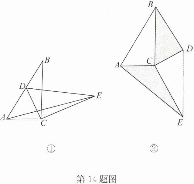 14. 两个全等三角形Rt△ABC和Rt△DEC有公共的顶点C. AC和DC、BC和EC分别是对应边.