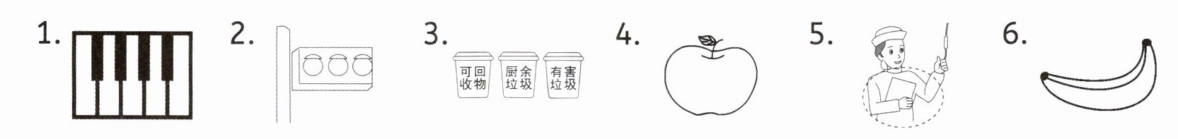 1. DE 2. CFG 3. CFH 4. CF 5. ADFH 6. G 解析 1. 图意:琴键。琴键为黑色和白色,故选DE。2. 图意:交通信号灯。交通信号灯包含三个灯,分别为红色、黄色和绿色,故选CFG。3. 图意:三个垃圾桶。可回收垃圾桶为蓝色,厨余垃圾桶为绿色,有害垃圾桶为红色,故选CFH。4. 图意:一个苹果。苹果为红色或绿色,故选CF。5. 图意:护士的衣服。护士服为粉色、白色、绿色或蓝色,故选ADFH。6. 图意:一根香蕉。香蕉为黄色,故选G。