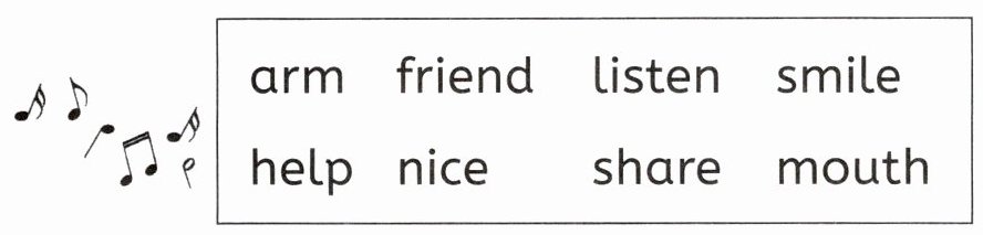 解析 歌谣翻译:我是一位好朋友吗?是的,我是!我倾听并说“嗨!”我也会微笑。我是一位好朋友吗?是的,我是!我会(给他人)帮助和分享。我做事也光明正大。此题只需在右边方框中圈出歌谣中出现过的单词即可。